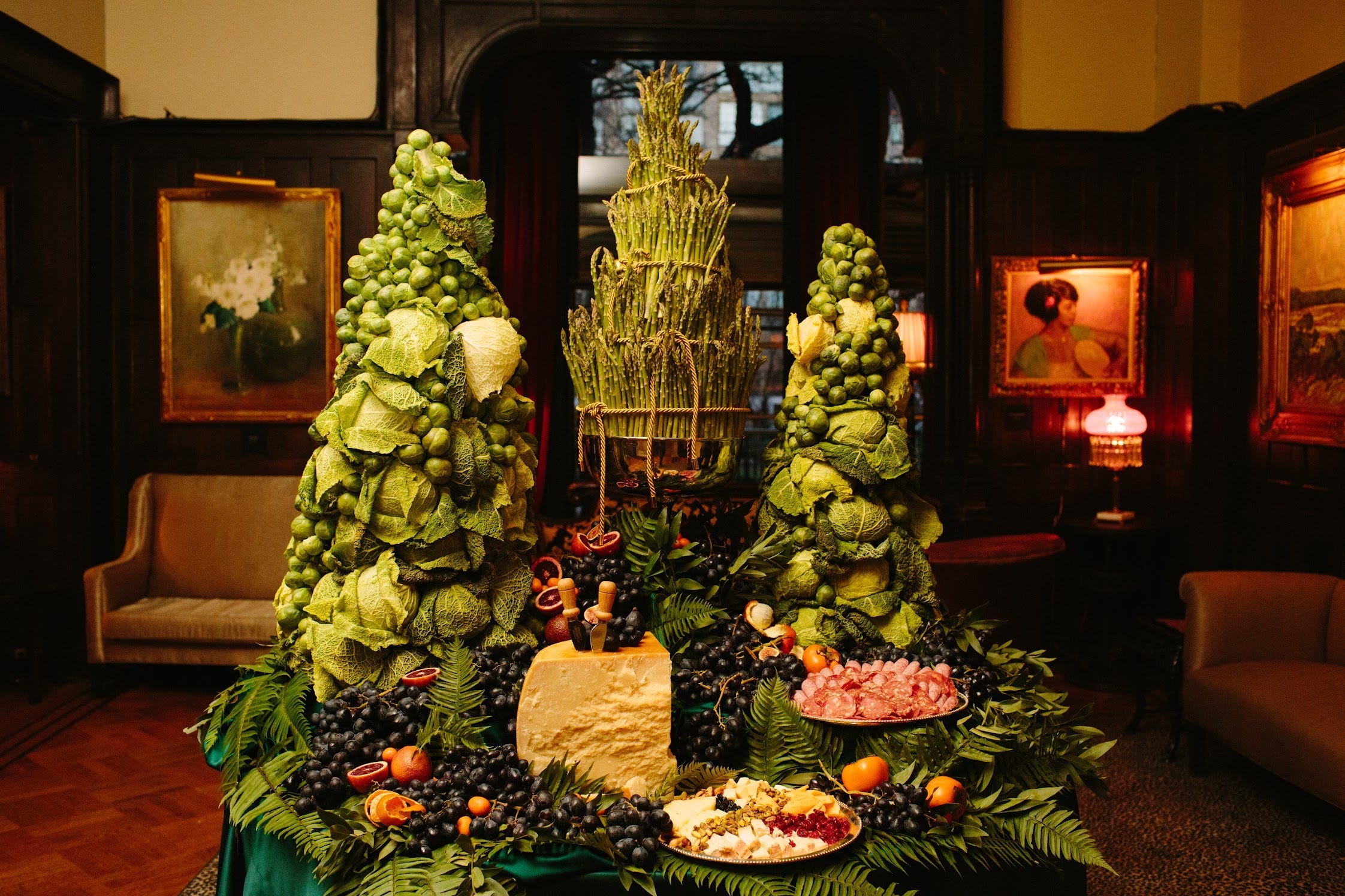 This started with the club chef – who was not exactly thrilled that our “wedding booking” was pushing him well outside his comfort zone. We began with the hors d’oeuvres, skipping the traditional list of options in favor of Emily’s rough sketches: center tables stacked with asparagus and cabbage towers, edibles dangling from layered serving pieces. James was in charge of procuring the Parmesan wheel!